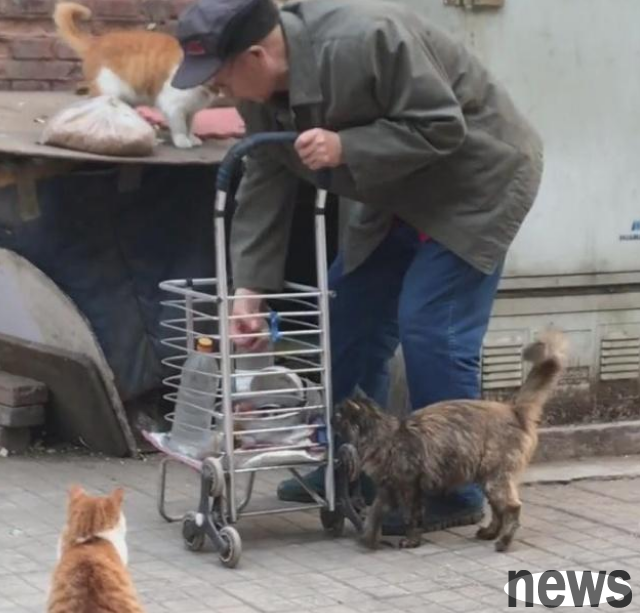 The old man has been feeding stray cats for decades, around 9 am every morning, the old man put on a thick cotton jacket, putting the cat food and water into his trolley. After everything is ready, he starts to go out to feed stray cats. There are several groups of stray cats nearby. The old man has to push the cart until noon before he can feed them all. At most, dozens of stray cats should be fed in a day.