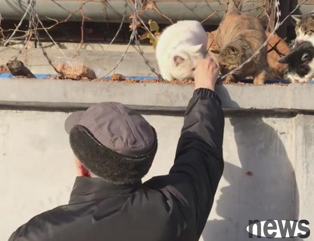 Some cats are afraid of being angry and don't like to eat on the ground, so the old man personally delivers the cat's food to the cat's mouth. The cat's standing is a bit high, and the old man sometimes has to tiptoe, which shows that the old man really loves these cats very much.