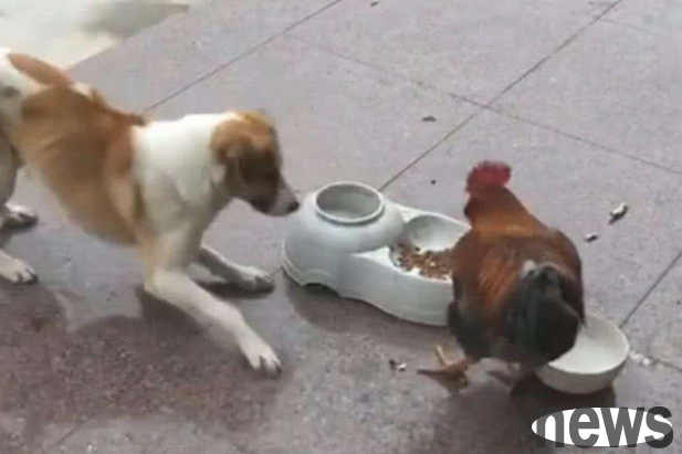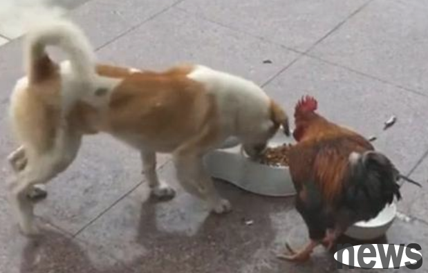 Let's take a look at it together. The little puppy was enjoying a big meal that day, but unexpectedly, his special delicacy was missed by the big rooster. The big rooster came to the side of the puppy domineeringly and pecked at its bowl. The little puppy was still eating it.