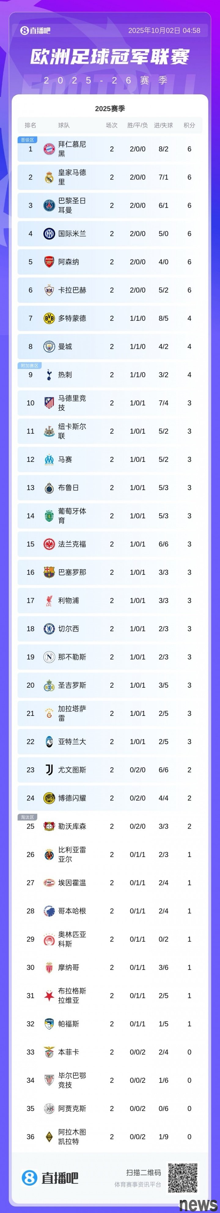The second round of the Champions League stage has been completed, and there are 6 teams left in the team that have won all the wins.