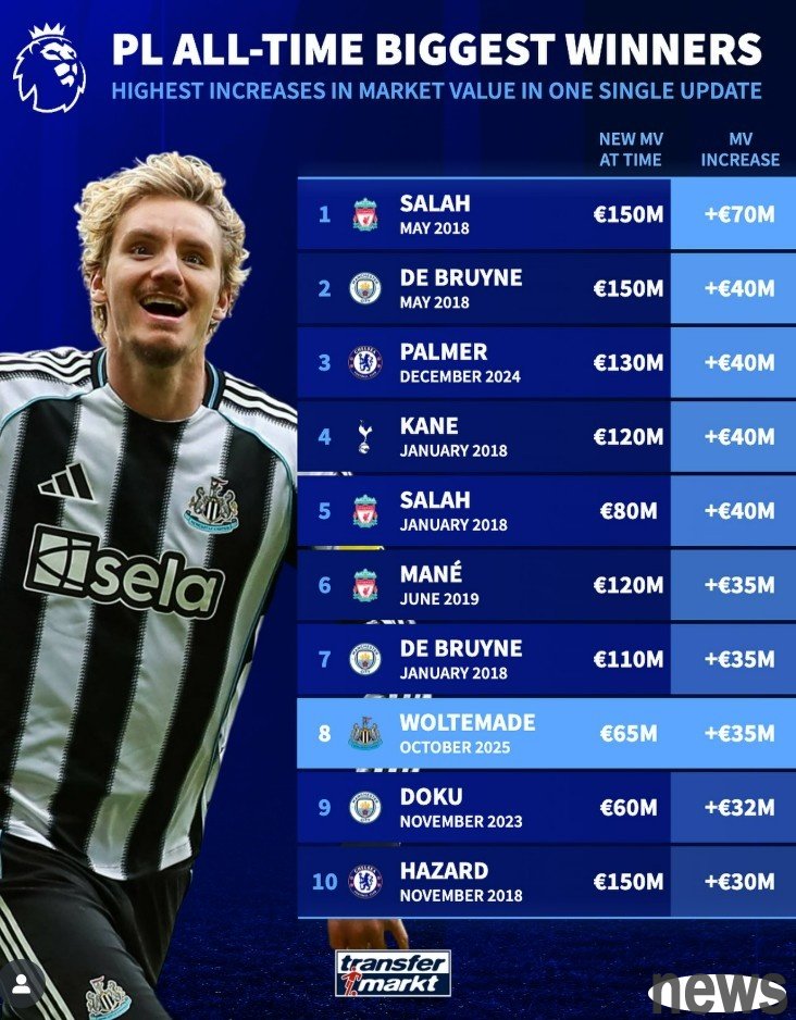 Dezhuan previously updated the value of football players, and took stock of the list of Premier League players with the highest value increase in a single update. The details are as follows: