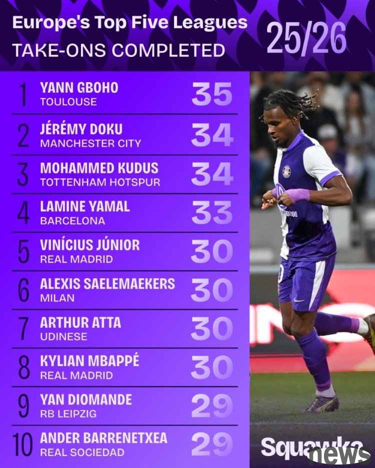 The war in the five major leagues is about to resume. The data agency Squakwa also calculated the number of successful dribbles by players in the five major leagues so far this season. Toulouse star Jan Boho topped the list.