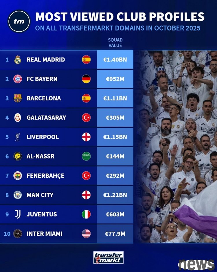 The German transfer market lists the ranking of club page views in October, with Real Madrid, Bayern, and Barcelona in the top three.