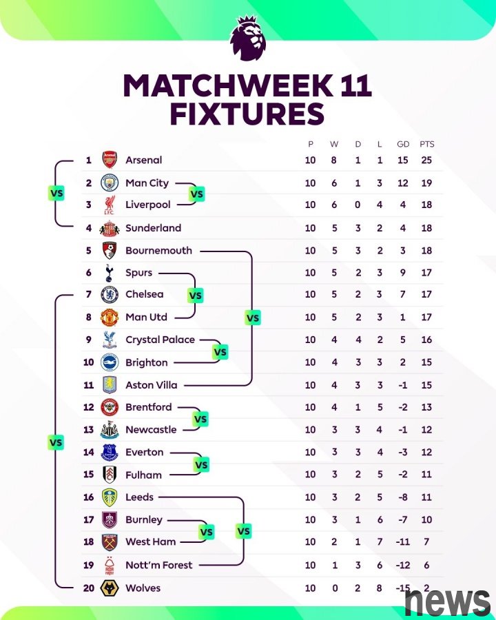 This weekend will usher in the 11th round of the Premier League. Before the game, the Premier League official used a chart to clearly show the ranking comparison of the teams in this round.