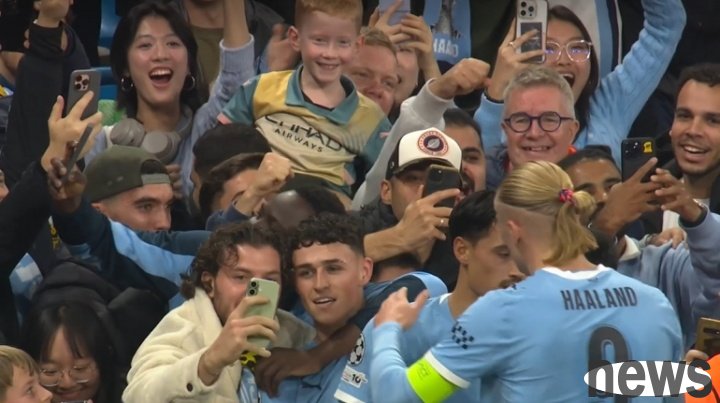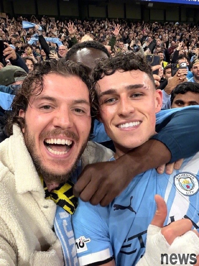 In the 22nd minute of the fourth round of the UEFA Champions League between Manchester City and Dortmund, Foden ran to the corner flag area to celebrate after scoring a goal. A fan hugged him and took a selfie. Foden even looked at the camera and smiled in a very cooperative manner.